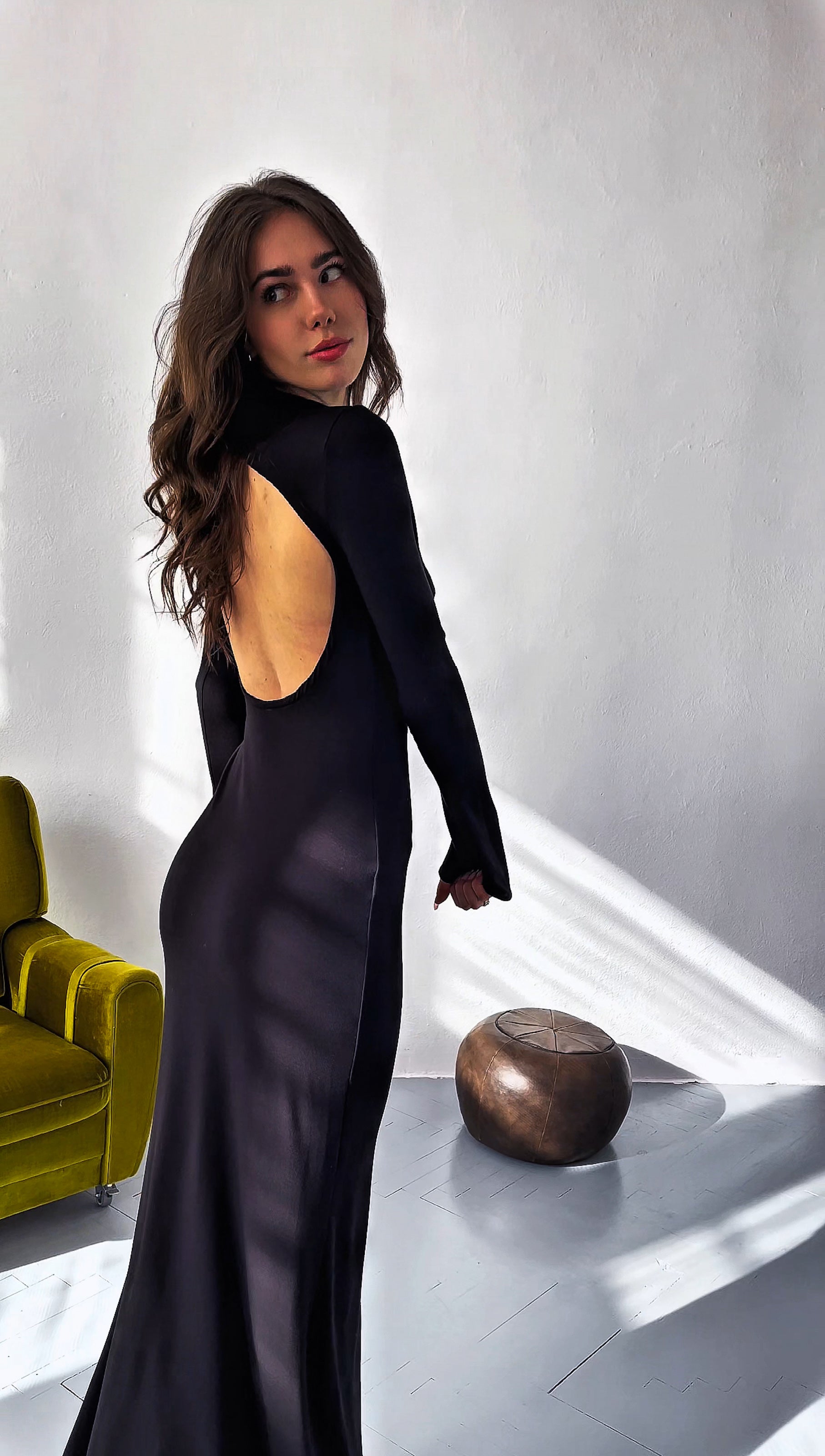 Ta czarna sukienka do kostek to kwintesencja szykownej prostoty i kobiecej elegancji. Góra dopasowana podkreśla figurę, a od ud dół układa się nieco luźniej, co nadaje sylwetce lekkości i subtelnego wdzięku. Długie rękawy oraz niewielka stójka dodają wyrafinowanego charakteru, a duże okrągłe wycięcie na plecach wprowadza nutę zmysłowości, przyciągając spojrzenia. Elastyczna dzianina z wiskozy sprawia, że sukienka doskonale dopasowuje się do ciała, jednocześnie zapewniając wygodę podczas noszenia.