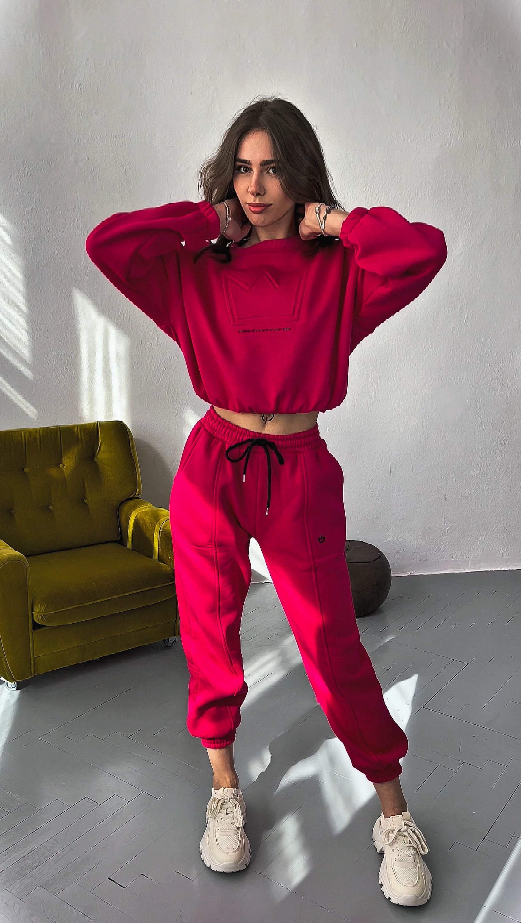 Damski komplet dresowy w kolorze fuksji to połączenie komfortu i modnego wyglądu w codziennym wydaniu. Wykonany z miękkiej, bawełnianej tkaniny świetnie sprawdzi się o każdej porze roku – od chłodniejszych dni wiosny po jesień i zimę. Bluza z długimi rękawami zakończonymi ściągaczami oraz elastycznym dołem może być także noszona podwinięta, co nadaje stylizacji bardziej swobodny charakter. Ozdobna 3D aplikacja z napisem na przodzie bluzy przyciąga wzrok i dodaje sportowego akcentu.
